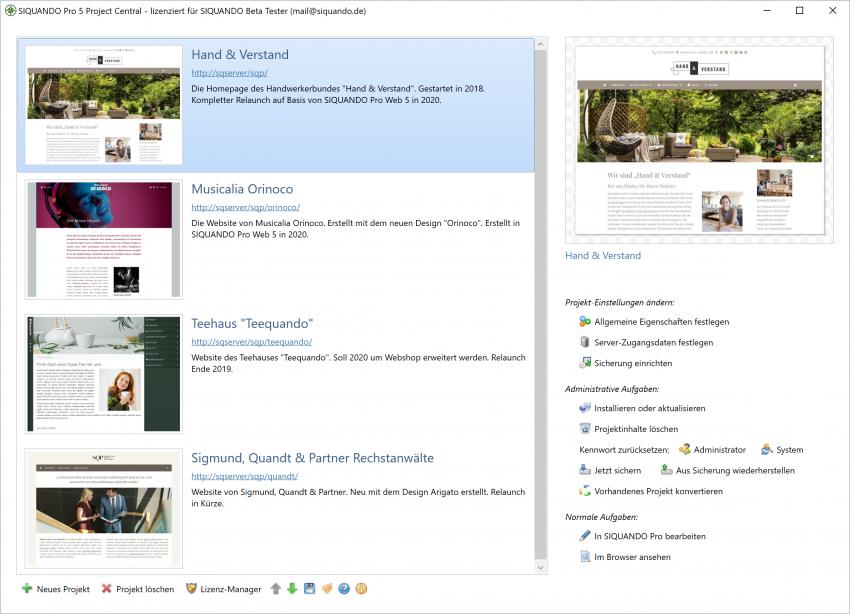 SIQUANDO Pro Web liegt ein einzigartiges Funktionsprinzip zugrunde: eine leistungsfähige Windows-Software kommuniziert mit einer Server-Komponente, die bei Ihrem Provider gehosted wird – zusammen mit Ihren Texten, Bildern und anderen Inhalten. So bleiben Sie jederzeit Herr Ihrer wertvollen Daten. Professionell gestaltete Weblayouts bilden den attraktiven Rahmen für Ihre Website, den Inhalt stellen Sie aus einer Riesenauswahl benutzerfreundlicher Absatzmodule zusammen. Änderungen sind auf Wunsch sofort online und Sie haben jederzeit und von überall Zugriff auf Ihr Projekt.