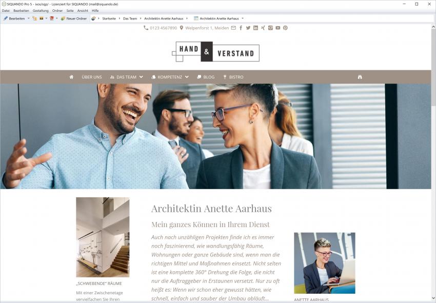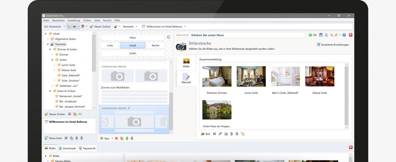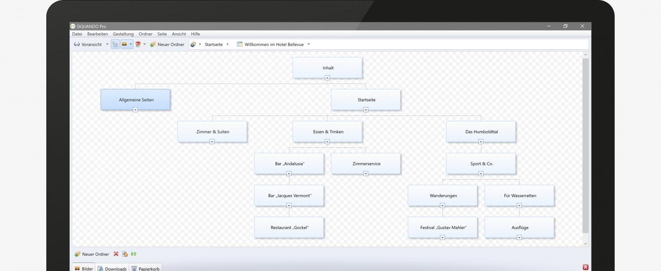 Der Schlüssel zu wegweisenden Websites ist neben interessanten Inhalten ein leistungsfähiges und dennoch einfach zu bedienendes Homepage-Werkzeug. Darum möchten wir Ihnen unser Flaggschiff SIQUANDO Pro Web 5 ans Herz legen. Mit diesem innovativen Webbaukasten realisieren Sie mit spielerischer Leichtigkeit beeindruckende Webauftritte, die von A bis Z auf der Höhe der Zeit sind.