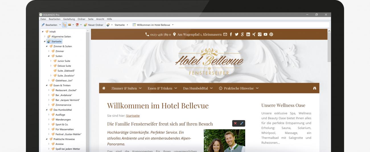 SIQUANDO Pro Web liegt ein einzigartiges Funktionsprinzip zugrunde: eine leistungsfähige Windows-Software kommuniziert mit einer Server-Komponente, die bei Ihrem Provider gehosted wird – zusammen mit Ihren Texten, Bildern und anderen Inhalten. So bleiben Sie jederzeit Herr Ihrer wertvollen Daten. Professionell gestaltete Weblayouts bilden den attraktiven Rahmen für Ihre Website, den Inhalt stellen Sie aus einer Riesenauswahl benutzerfreundlicher Absatzmodule zusammen. Änderungen sind auf Wunsch sofort online und Sie haben jederzeit und von überall Zugriff auf Ihr Projekt.