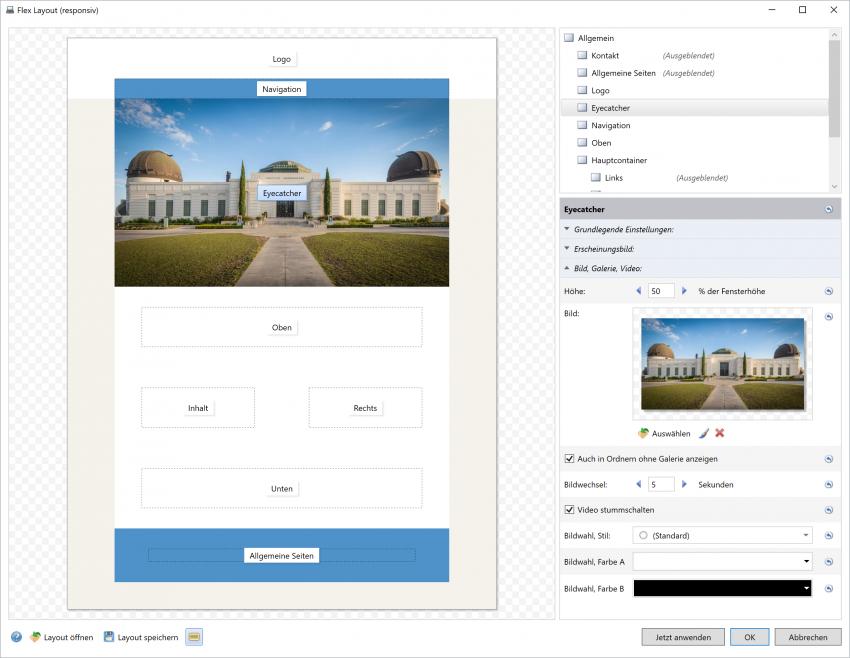 Inspiration gefällig? Kein Problem! Der responsive Flex-Design-Editor wird zusammen mit insgesamt acht responsiven Beispiel-Layouts geliefert, die Sie nach Lust und Laune modifizieren können. Zum Beispiel dem eleganten „Atrium“ mit seiner zurückhaltend-modernen Gestaltung.