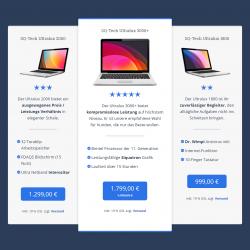 In einem attraktiven Spaltenlayout präsentieren Sie Ihren Besuchern Ihr Angebot mit unterschiedlichsten Inhaltsmodulen, wie Bildern, Trennlinien, Symbolen, Bewertungssternen und mehr. Stellen Sie Ihre Top-Auswahl optisch heraus, und befreien Sie Interessenten von der „Qual der Wahl“.